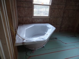 The electrical and plumbing teams have officially completed their designated rough-ins. Often times it makes more sense to place over-sized finished plumbing fixtures into position before the interior walls are completely finished. As you can see here, the large corner Jacuzzi tub has been placed in its desired location. It will get put to good use before long.