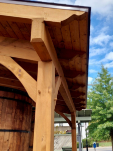 - 4×8 Rafters with custom scroll-cut rafter tails that mirror the architectural style of the park’s nearby structures
