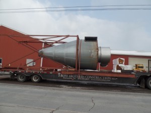 What is involved in moving something of this magnitude, you ask? After careful preparation, the plan was executed with 1 crane, 2 forklifts, 3 hours, and 4 specially skilled technicians who precisely strapped the cyclone to the crane, lifted it off its metal frame and gradually transferred it from its original location to a flatbed trailer.