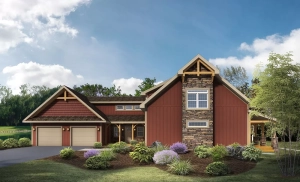 The barn-styled timber frame exterior is finished with Countrylane Red Hardie Board siding, handcrafted decorative trusses, and stone accents.