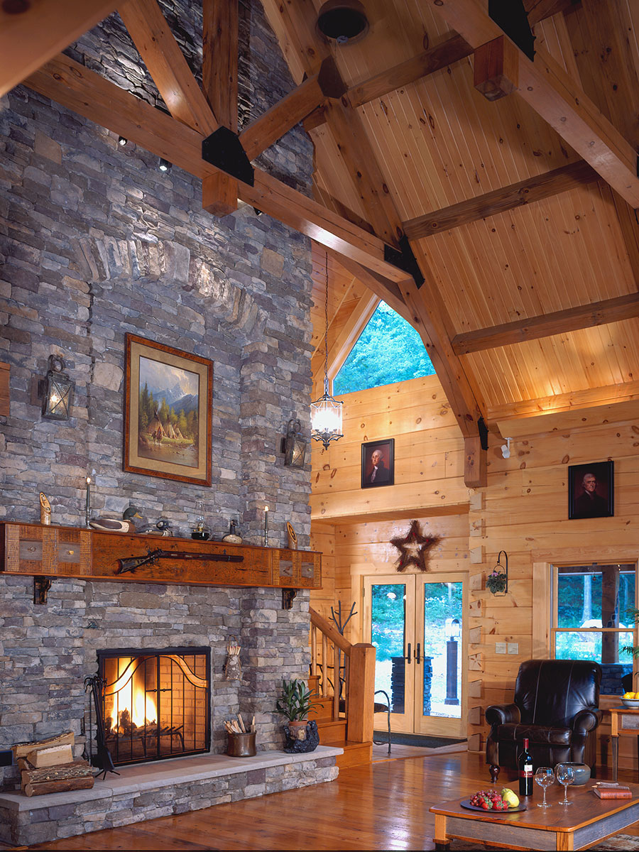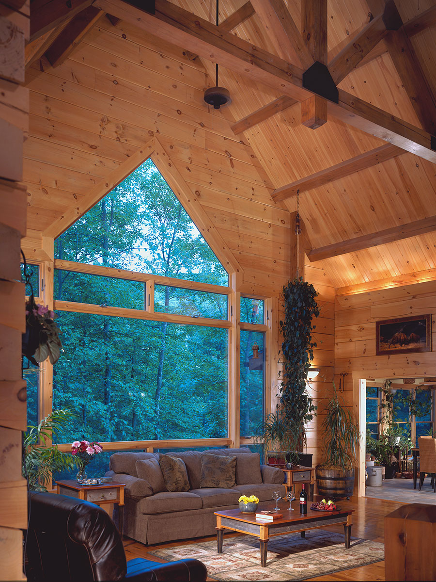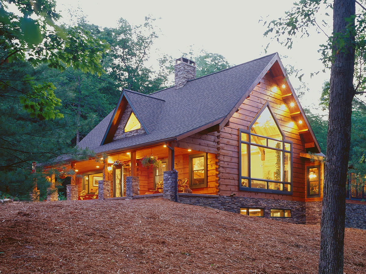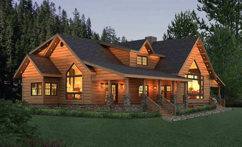 The Pleasant Grove log home design offers 3,187 square feet of total living space. The floor plan features 3 bedrooms and 2.5 baths. The log home plan provides spacious accommodations in virtually every room, from an incredible master bedroom suite to the open, combined kitchen and dining areas, stunning custom wall of glass and jaw-dropping view of a soaring fireplace and cathedral ceiling. The Pleasant Grove is shown here with our 6×12 Single Notch with Chinking Groove log profile and Dovetail corner assembly.