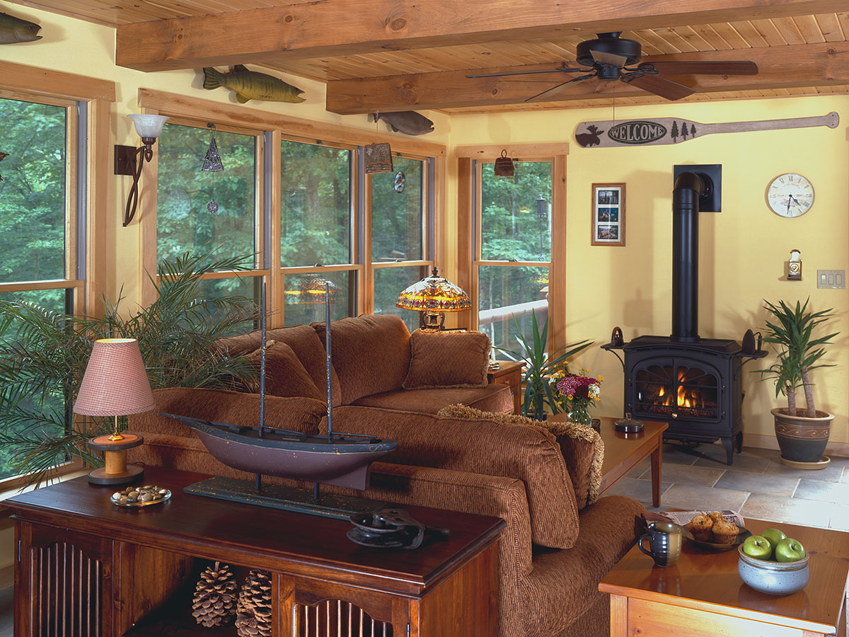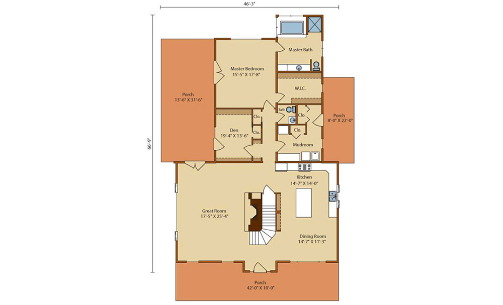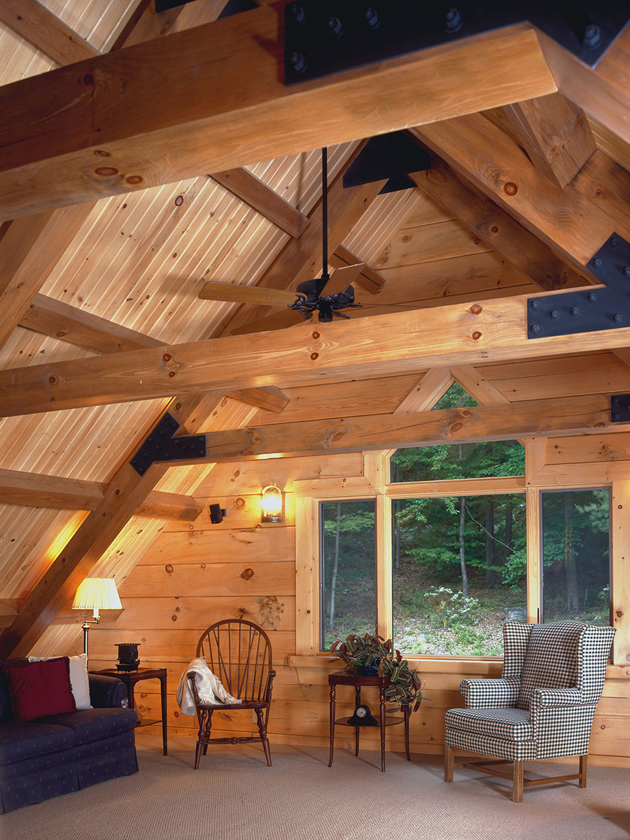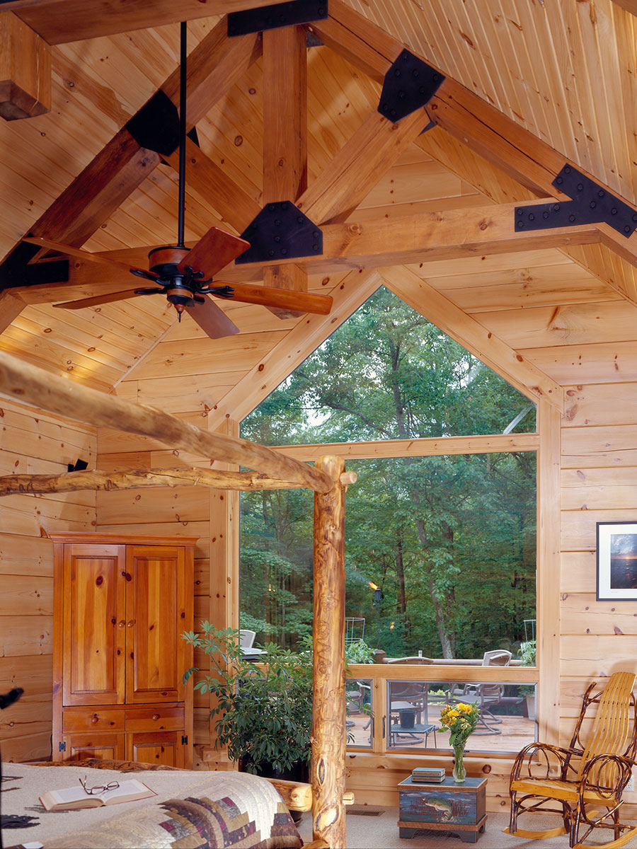 The Pleasant Grove log home design offers 3,187 square feet of total living space. The floor plan features 3 bedrooms and 2.5 baths. The log home plan provides spacious accommodations in virtually every room, from an incredible master bedroom suite to the open, combined kitchen and dining areas, stunning custom wall of glass and jaw-dropping view of a soaring fireplace and cathedral ceiling. The Pleasant Grove is shown here with our 6×12 Single Notch with Chinking Groove log profile and Dovetail corner assembly.