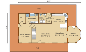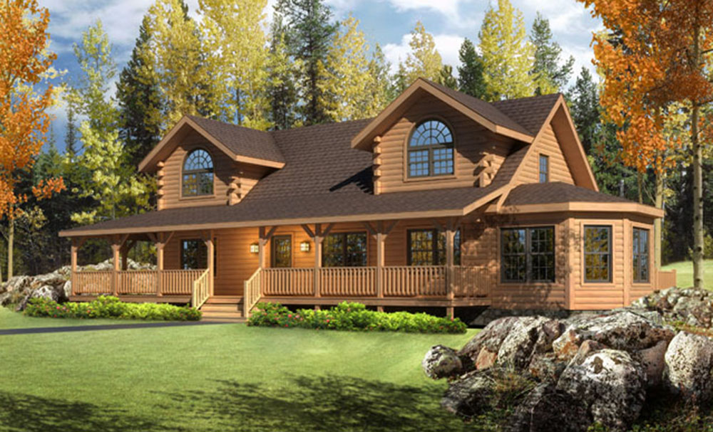 The Riverview log home design offers 2,470 square feet of total living space. The floor plan features 3 bedrooms and 2.5 baths. The log home plan includes symmetrical front dormers with circle-top windows, spacious front porch and octagon sunroom. The eye-appealing exterior and a functional, roomy interior can be yours with the Riverview log home package by Timberhaven Log & Timber Homes.