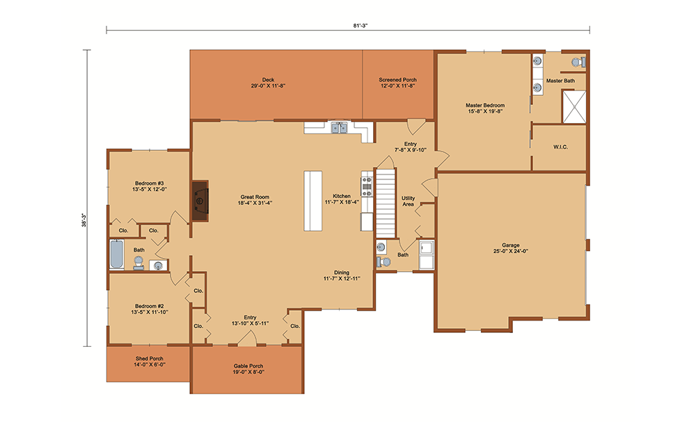 At a little over 2,300 sq. ft., this 3-bedroom, 2.5-bath log home masterpiece features an open floor plan that gives you the best of both worlds— a home that is the perfect blend of spacious and cozy. Just off the front porch, the entryway, with ample closet space, leads into the great room, kitchen, and dining area, which opens up to a rear deck that’s perfect for relaxing or entertaining. The adjoining utility area is both functional and convenient, housing a guest bath, as well as entry into both the garage and master suite, which boasts a walk-in closet and private bath. At the opposite end of the log home are two bedrooms with a shared bath. Last, but certainly not least, are the plethora of windows that are just perfect for drawing in natural light and soaking up scenic views.