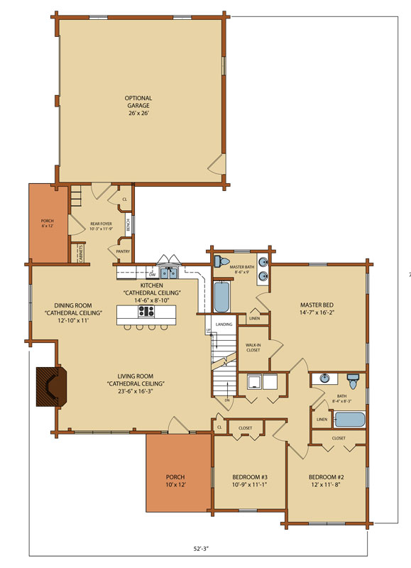 The Northwood log home design offers 2,051 square feet of total living space. The floor plan features 3 bedrooms and 2 baths. The log home plan provides a distinctive profile for a one-level home, accentuated by varied roof lines and footprint. The three bedrooms occupy the right wing of the home while the main living areas provide a wide-open concept. Ranch living with style can be yours with the Northwood log home package by Timberhaven Log & Timber Homes.