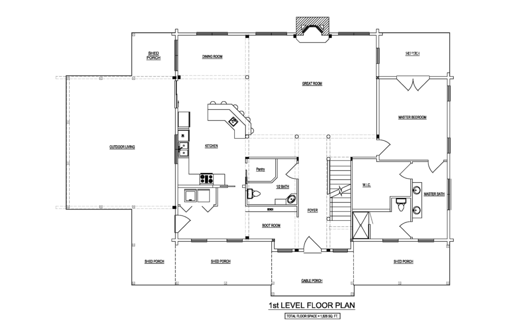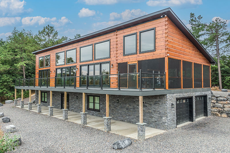 This modern log home design seamlessly blends natural warmth with contemporary flair. The 1,800 sq. ft. retreat features 6×12 Premium-Grade Kiln-Dried Engineered Logs, shaped in our Dutch Lap profile and using our signature Dovetail Corner assembly. Crowned with a single sloping shed roof, this log home offers a sleek silhouette that complements the surrounding landscape—so beautiful, it defies description. (Be sure to check out the 360 views for yourself!) Black windows and doors provide a striking contrast, enhancing the home’s bold aesthetic. Inside, you’ll find 2 bedrooms, 2 baths, and an open living space, perfect for relaxation and entertaining alike. The deck spans the entire length of the log home, while a screened-in porch with a cozy fireplace invites you to enjoy serene sunsets in comfort.